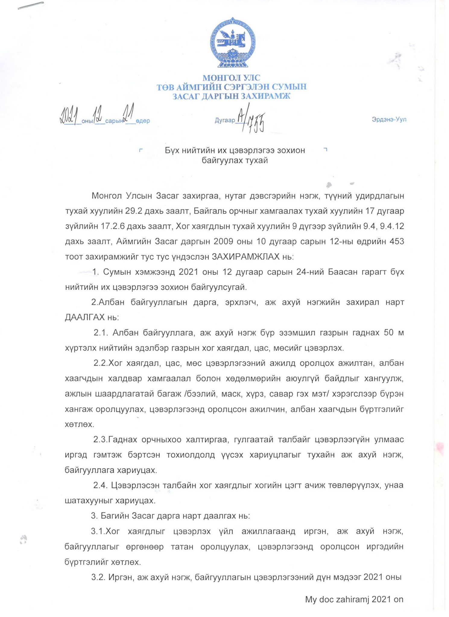2021 оны 12 дугаар сарын 24-ны өдөр бүх нийтийн их цэвэрлэгээг сумын хэмжээнд зохион байгуулах тул Хог хаягдлын тухай хуулийн 10 дугаар зүйл Хог хаягдлын талаар иргэн, аж ахуйн нэгж, байгууллагын эрх, үүрэг 10.2.6.нийтийг хамарсан цэвэрлэгээнд хамрагдах, 10.2.10.энэ хуулийн 9.4.12-т заасан нийтийн эдэлбэр газрын хог хаягдалыг цэвэрлэх болон иргэн, аж ахуй нэгж бүр эзэмшил газрын гаднах 50 м хүртлэх нийтийн эдэлбэр газрын хог, хаягдлыг цэвэрлэх тус тус заасны дагуу эзэмшиж буй газрынхаа ойр орчмын хог хаягдлыг цэвэрлэх ажлыг зохион байгуулж олон нийтийн ажилд идэвхитэй оролцоно уу.