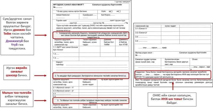 Иргэд ОНХС-д саналаа өгөх нэг арга нь "санал асуулгын хуудас" бөглөх юм. Тус хуудсанд тухайн орон нутгийн ЗДТГ-аас санал болгож буй хөрөнгө оруулалтын жагсаалт, иргэний өөрийн санал бичих хэсэг, Малын тоо толгойн албан татварын санал бичих хэсгүүдийг багтаасан байдаг.