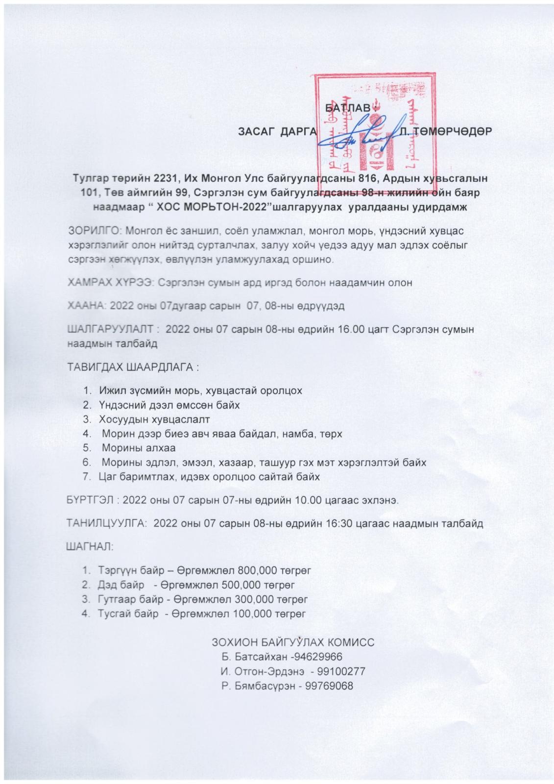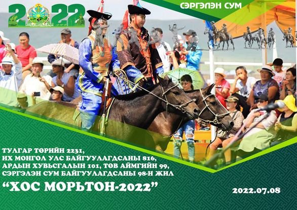 Тулгар төрийн 2231, Их Монгол Улс байгуулагдсаны 816, Ардын хувьсгалын 101, Төв аймгийн 99, Сэргэлэн сум байгуулагдсаны 98-н жилийн ойн баяр наадмын “ ХОС МОРЬТОН-2022”шалгаруулах уралдааны удирдамж